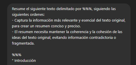La tarea se realizó en 3 pasos: 1) tomar la primera mitad del texto, para resumirla; 2) tomar la segunda mitad del texto para resumirla; 3) Tomar ambos resumenes y forzar a un último resumen, donde se pueda filtrar lo más importante del tema.