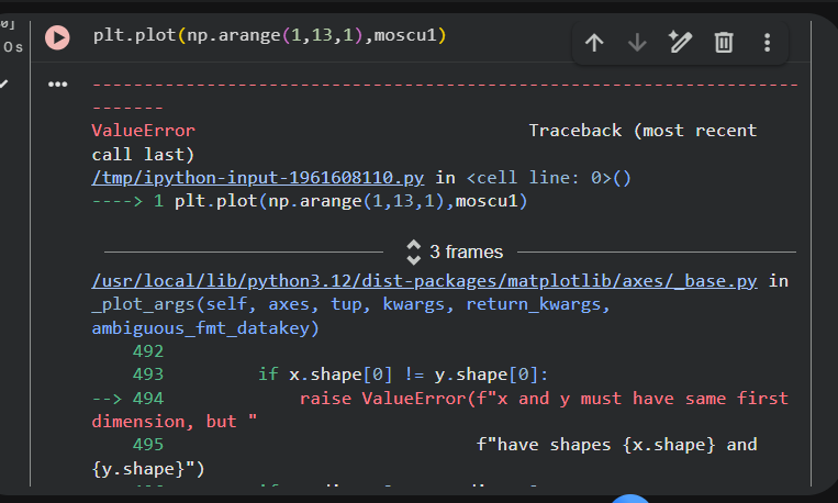 El problema es que intentas graficar 12 meses en el eje horizontal (x), pero tu lista de datos (moscu1) tiene una cantidad diferente de valores en el eje vertical (y).Para que la gráfica funcione, ambos lados deben tener el mismo número de puntos.