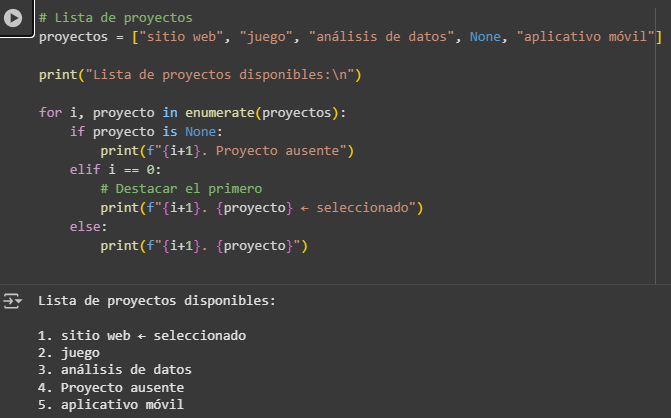 proyectos = ["sitio web", "juego", "análisis de datos", None, "aplicativo móvil"]